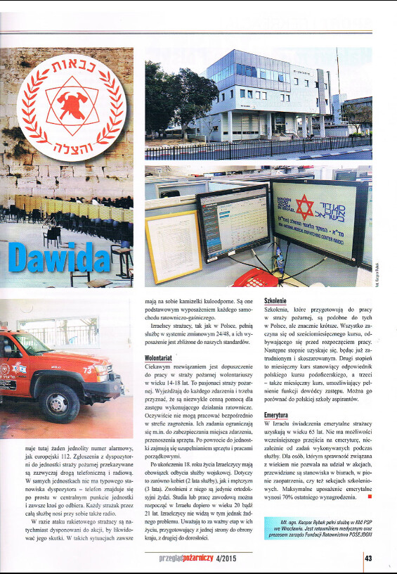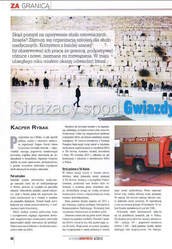 Artykuł pt. "Strażacy spod Gwiazdy Dawida" został przygotowany w marcu 2015 w Tel Awiwe podczas ustalania warunków współpracy pomiędzy Fundacją POSEJDON, a organizacją MDA i Strażą Pożarną.