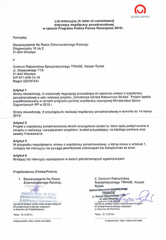 Po naszych doświadczeniach szkoleniowych z 2012 r., kiedy jako instruktorzy CRS TRIAGE z Wrocławia realizowaliśmy cykl kursów dla gruzińskich Służb Ratowniczych, podjęliśmy ponowną współpracę przy nowym projekcie szkoleniowym na rok 2015. Nasza fundacja rozpoczęła wspólne działania ze Stowarzyszeniem na Rzecz Zrównoważonego Rozwoju, czego wynikiem było złożenie projektu w Polskim MSZ dotyczącego szkolenia Ochotniczej Górskiej Służby Ratowniczej GRUZJI.